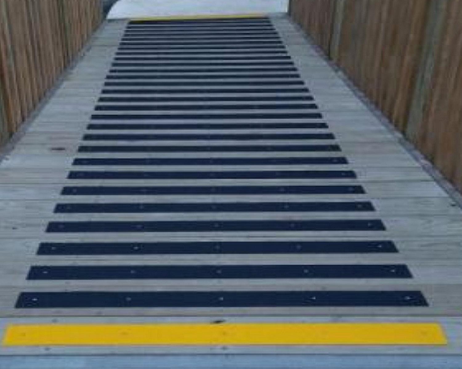 SafetyGrip strips, nosings and plates are perfect to enhance safety on a wide range of outdoor applications from garden steps and bridges to ramps into businesses or even onto boats. SafetyGrip products are made in black or yellow, with the yellow option being ideal to highlight step or deck edges, or the start and end of ramps or stairs. For larger areas where a strip is not sufficient to cover the hazard we can also supply plates. Made to measure the plates are produced with the same durable coating as applied to the strips.