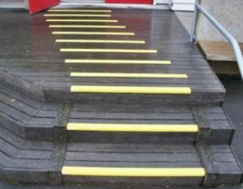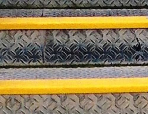 The bright safety yellow SafetyGrip Strips installed on these step edges not only ensure a safe, sure footing, they also highlight the step edges when the light is not very bright.
